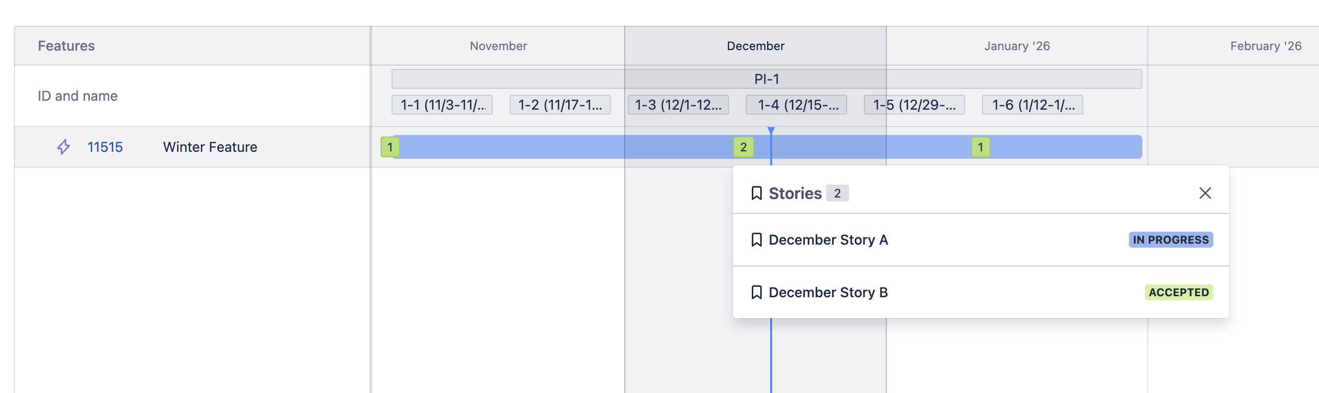 Story counts: See at a glance how many child stories are assigned to sprints while viewing features, helping you gauge scope and progress. You can enable this feature with the Show story counts toggle in View settings.