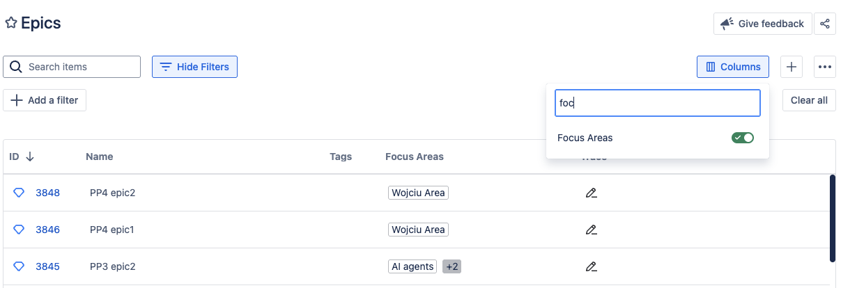 Focus Areas column: When Atlassian Guard is used, this new column will display, showing epics linked to focus areas in Focus.