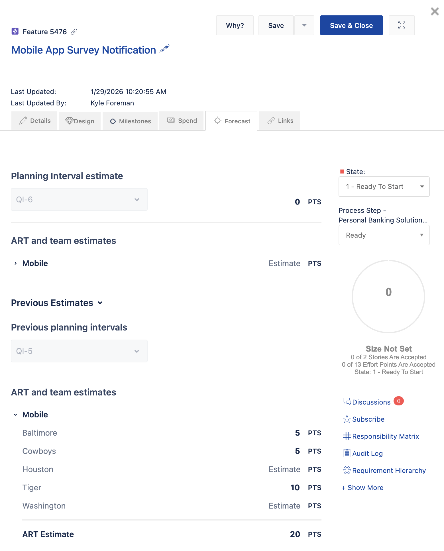 Previously, when removing planning intervals from features, capabilities, and epics, estimates associated with those work items were removed. Now, when removing a planning interval, users can still reference those estimates in the respective work item forecast tab.