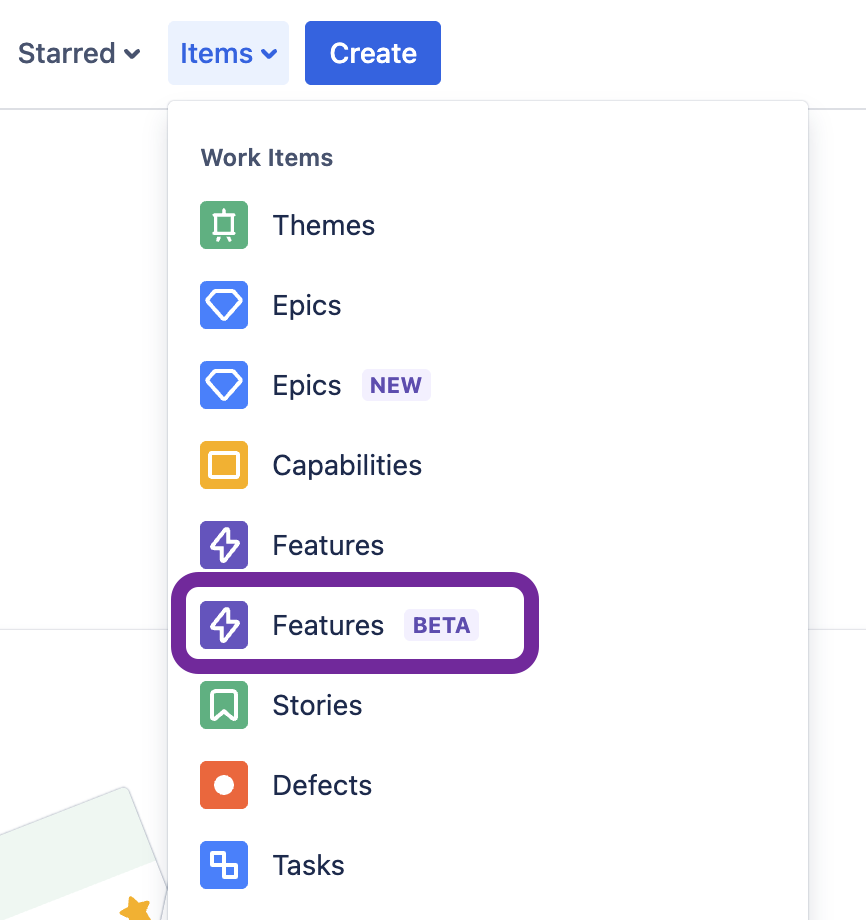 To access the new page, select the Features Beta link from the sidebar after accessing a portfolio, solution, or program. You can also reach the page from the Items menu in the top-right corner of Jira Align.