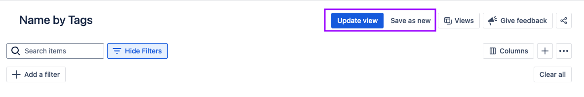 After accessing a view and making changes to the filters or other display settings, you’ll see an option to update the view, or save a new copy.