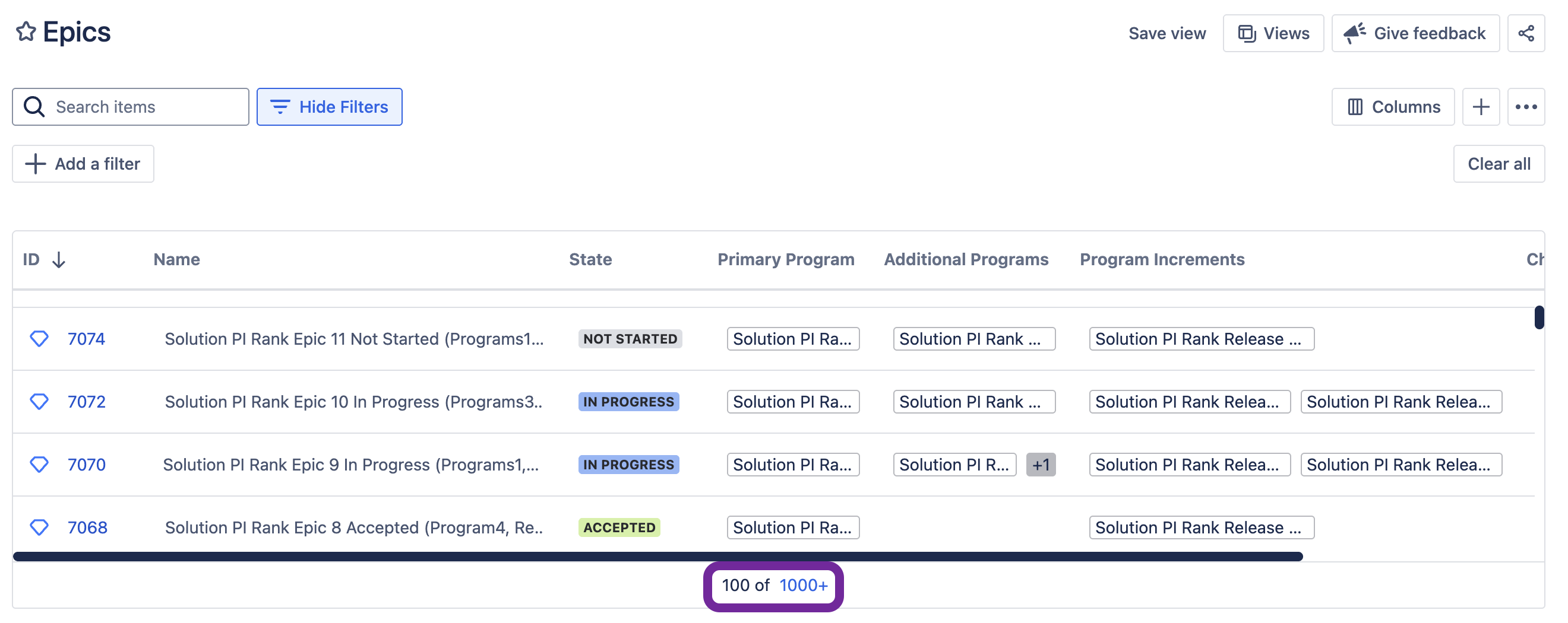 The total number of epics is now available at the bottom of the page. When there are fewer than 1000 epics meeting your filter criteria, the exact number is displayed instantly.